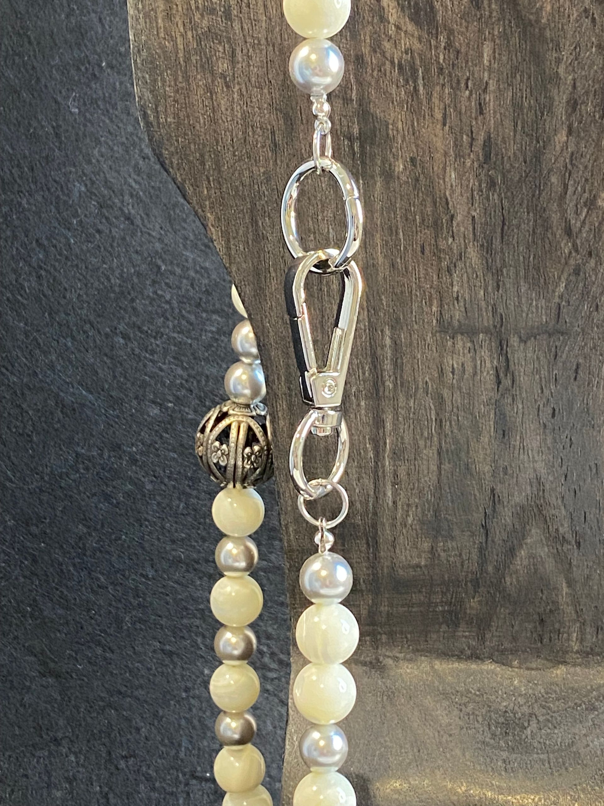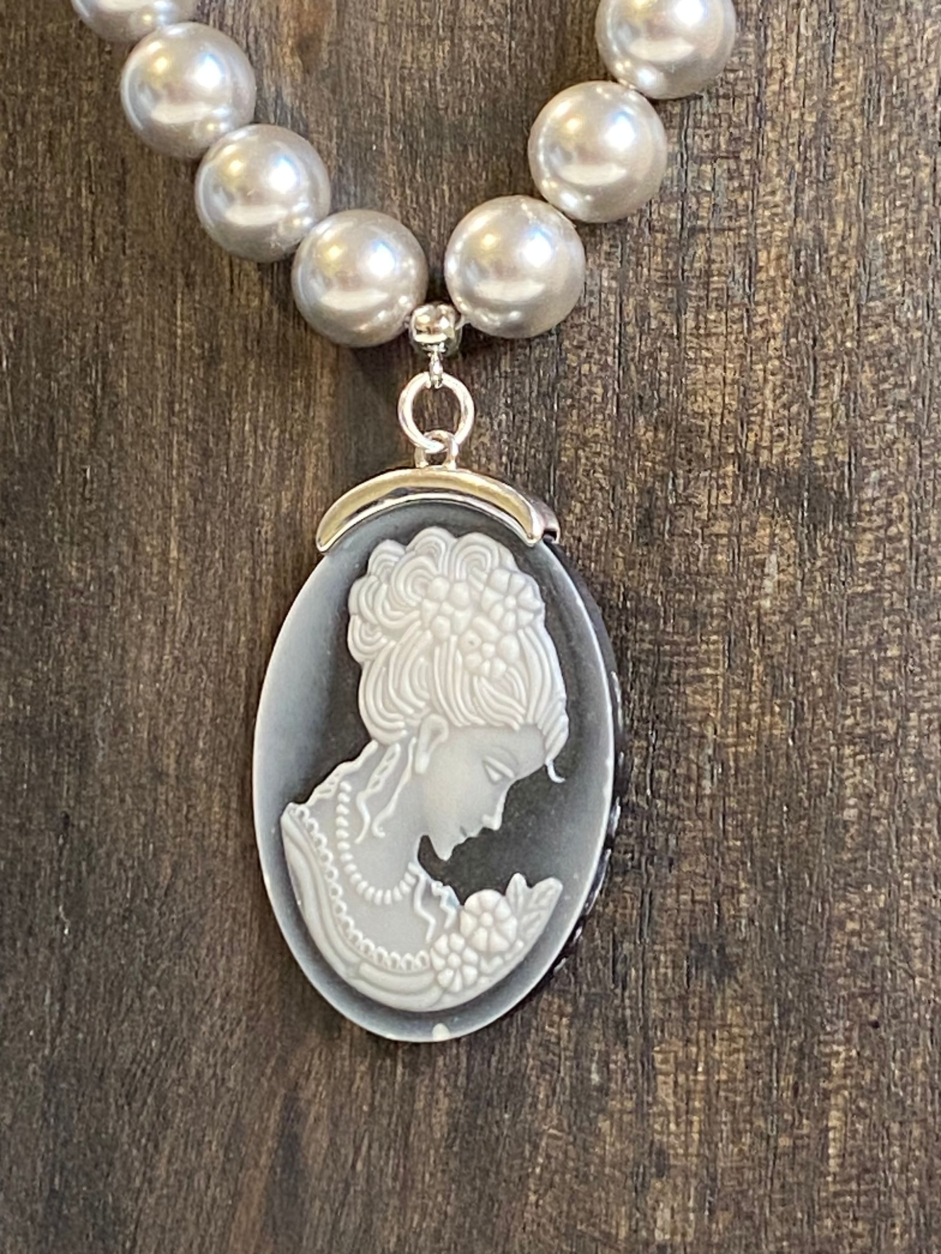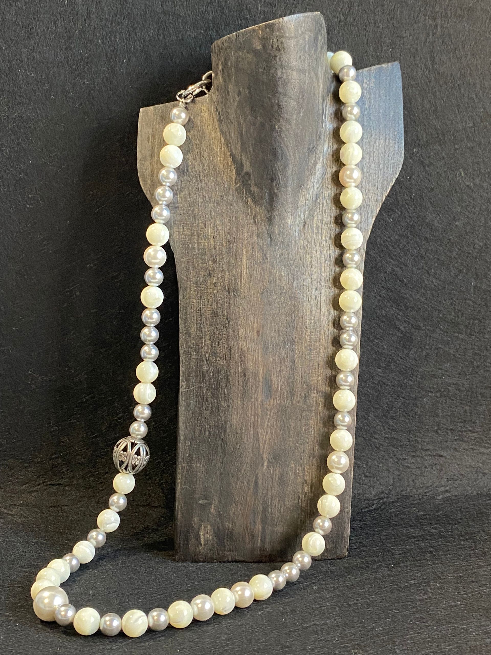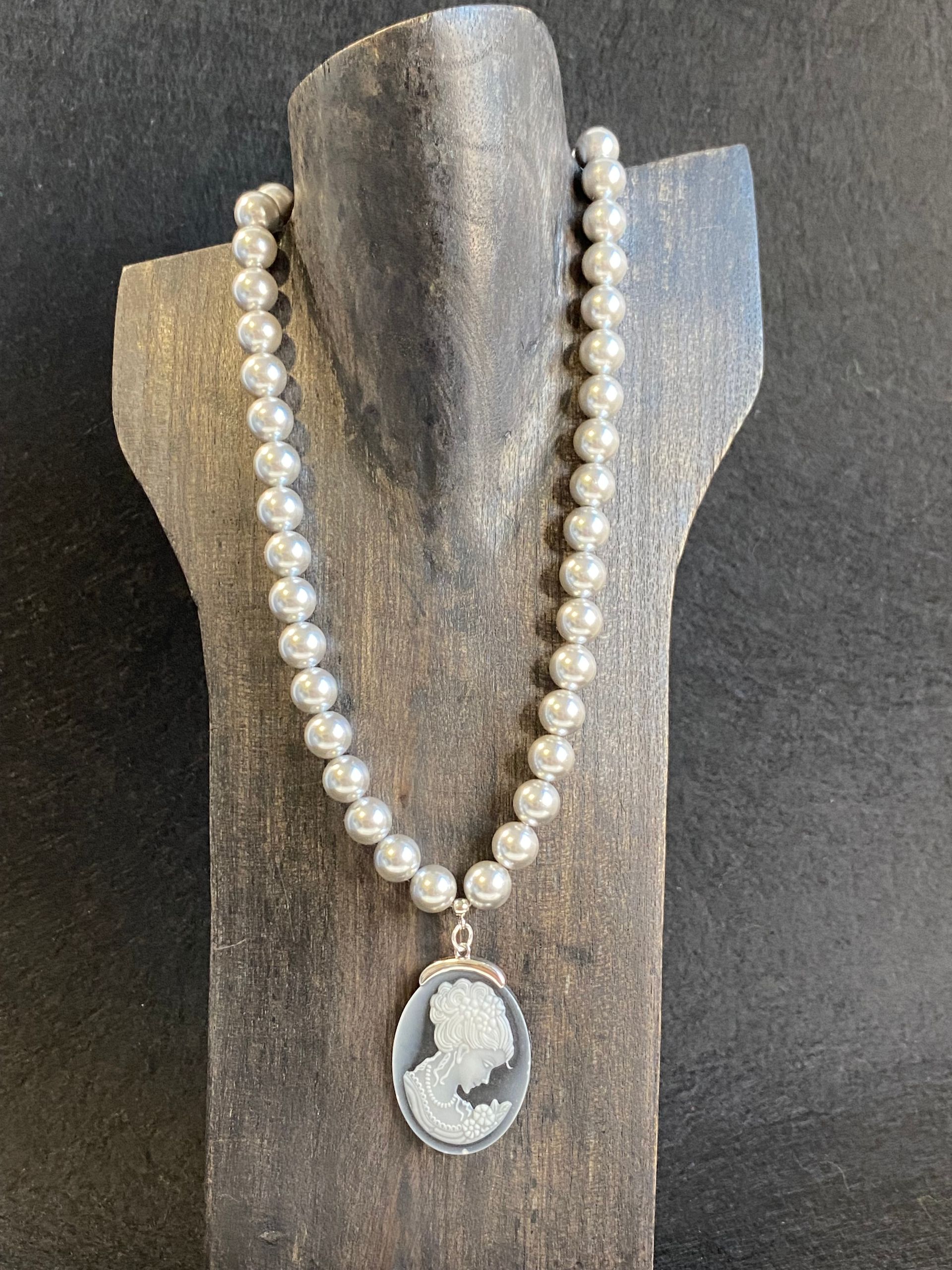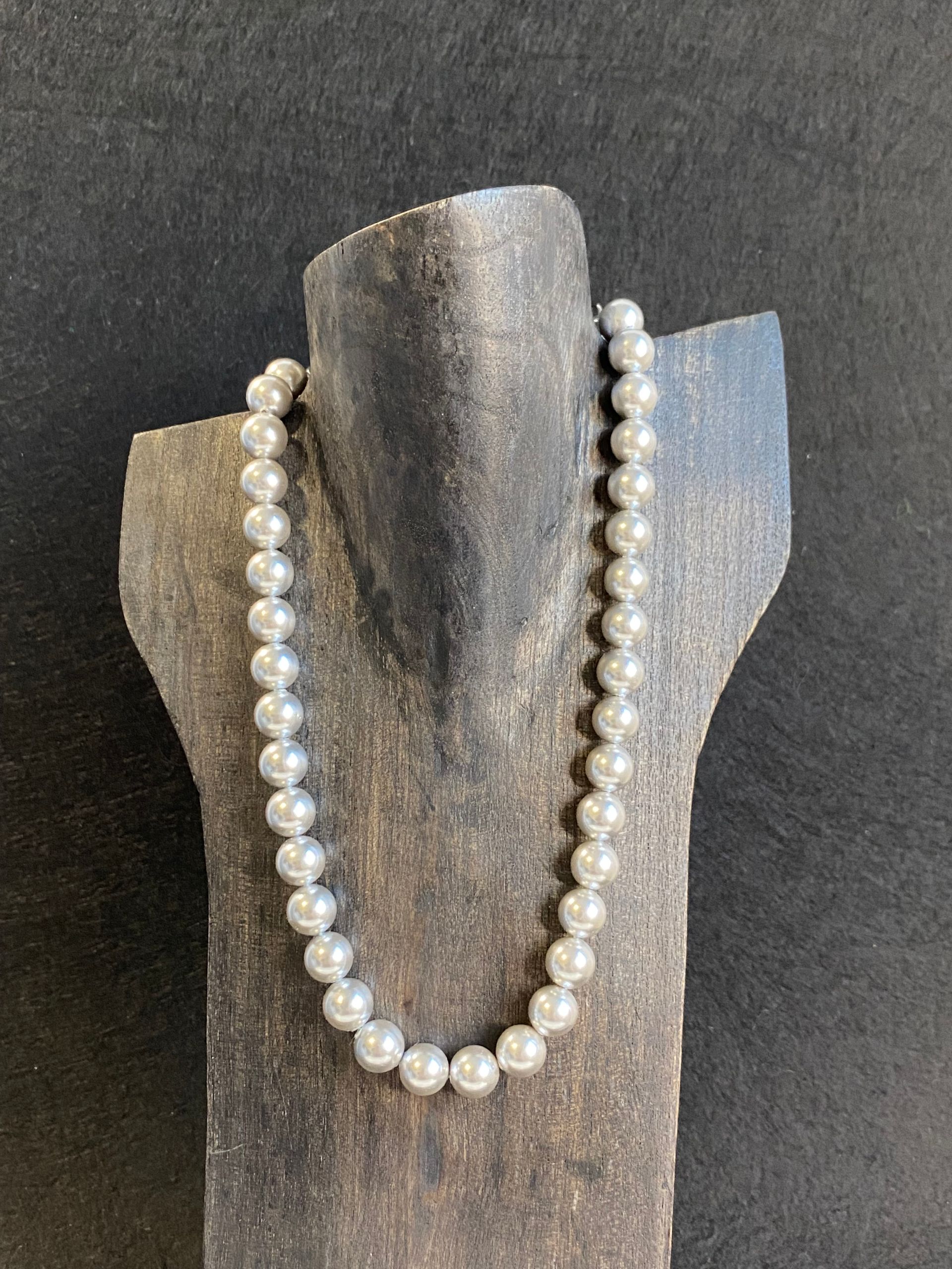 Collana in perle di maiorca grigia (10mm) con maxi finitura in metallo (senza nichel).